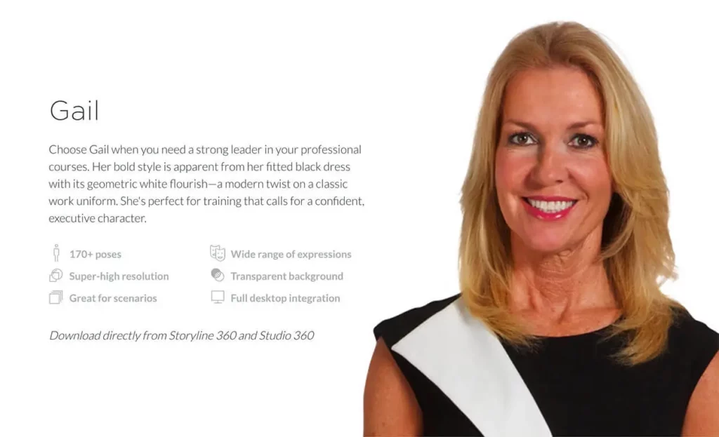Use the new Gail character when you need a strong, executive presence for your professional courses.