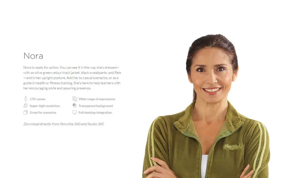 When you’re looking for a sporty character to use in a casual scenario or to guide your learners through health or fitness training, look no further than the new Nora character.