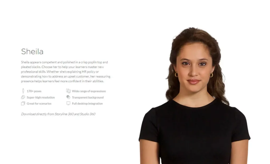 Use the new Sheila character when you need a confident, reassuring presence to help your learners master new professional skills.