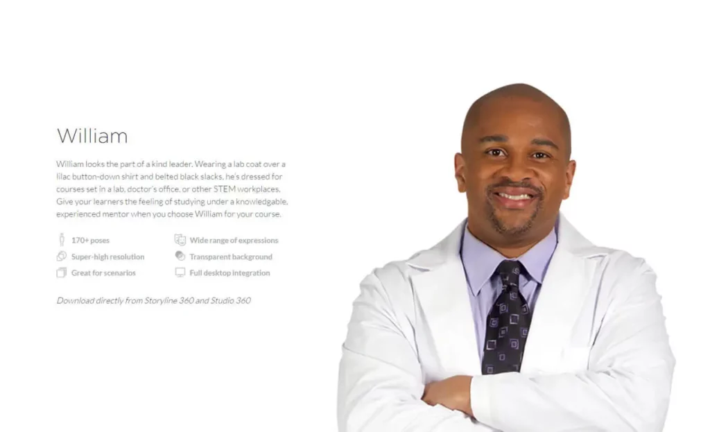 Dressed in a lab coat and sharp attire, the new William character is perfect for when you need a professional to lead your learners through medical or engineering content.